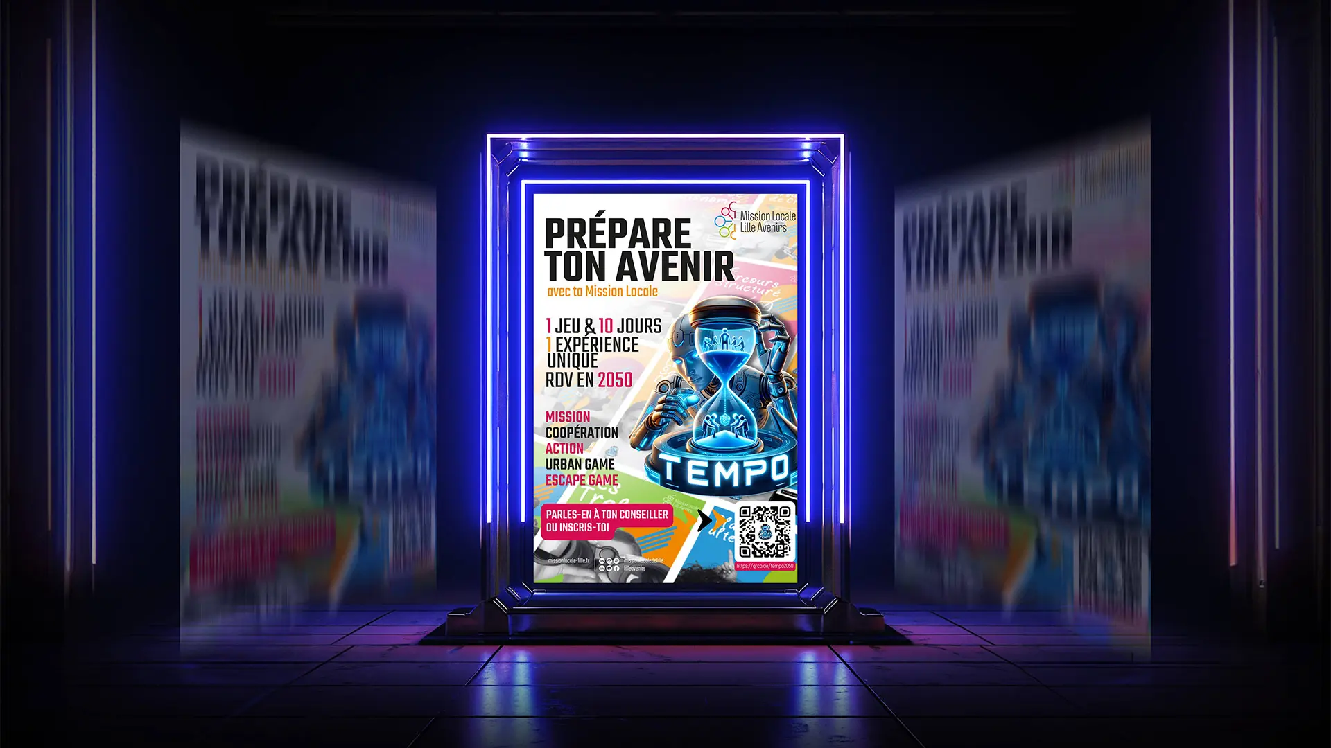 Imaginé par Immersize et porté par la Mission Locale Lille Avenirs, Tempo transforme dix jours d’accompagnement vers l’emploi en une aventure continue. Plutôt qu’enchaîner ateliers et rendez-vous classiques, les jeunes avancent dans un récit futuriste où chaque journée correspond à un nouvel épisode : missions à réaliser, rencontres, décisions à prendre, défis collectifs. L’expérience alterne temps de jeu (escape games, urban games, défis en équipe) et temps d’ancrage plus concrets, directement reliés à leurs réalités : emploi, formation, logement, mobilité, santé, vie quotidienne.